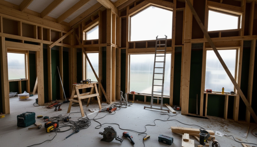 В качестве герметизирующих материалов может использоваться монтажная пена, которая заполняется по периметру и закрывает все зазоры. Внутри и снаружи стыки заделывают специальной лентой или другими материалами. После остекления проводится отделка каркасного дома.